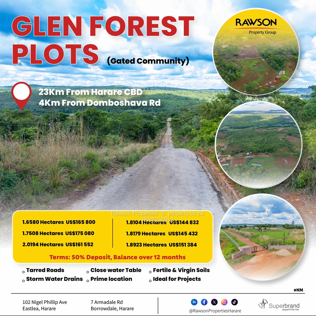 Agro-residential plots are for sale just 4km from Domboshava Road and just 23km from Harare CBD. The plots are in a secure gated community with limited access. The area is very prime with very fertile soils, good watertable and fully serviced. The gated community has tarred roads, good drainage system and has virgin soils.