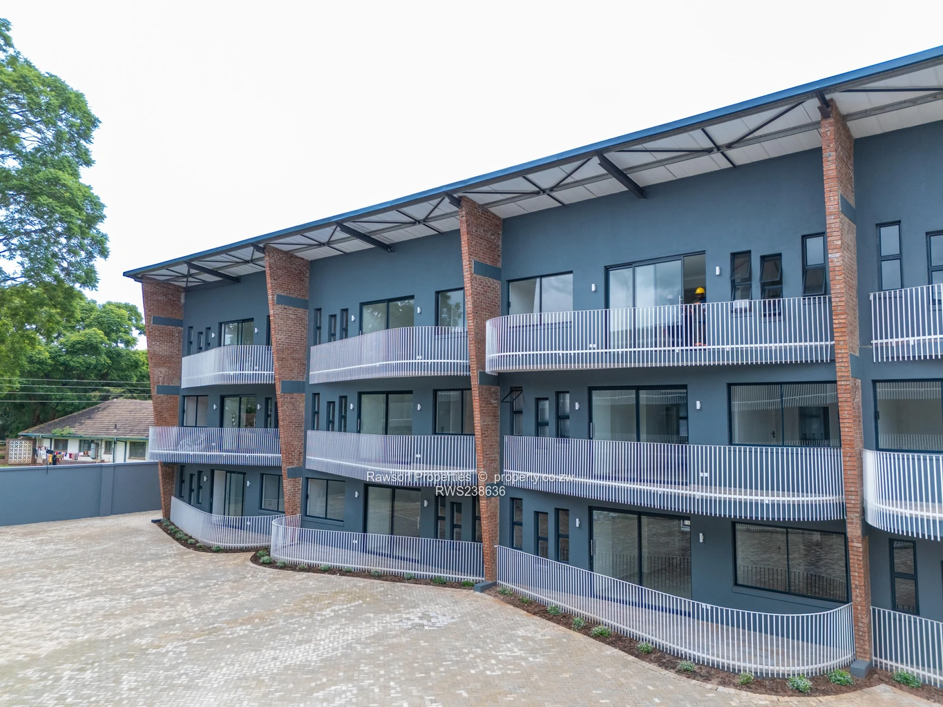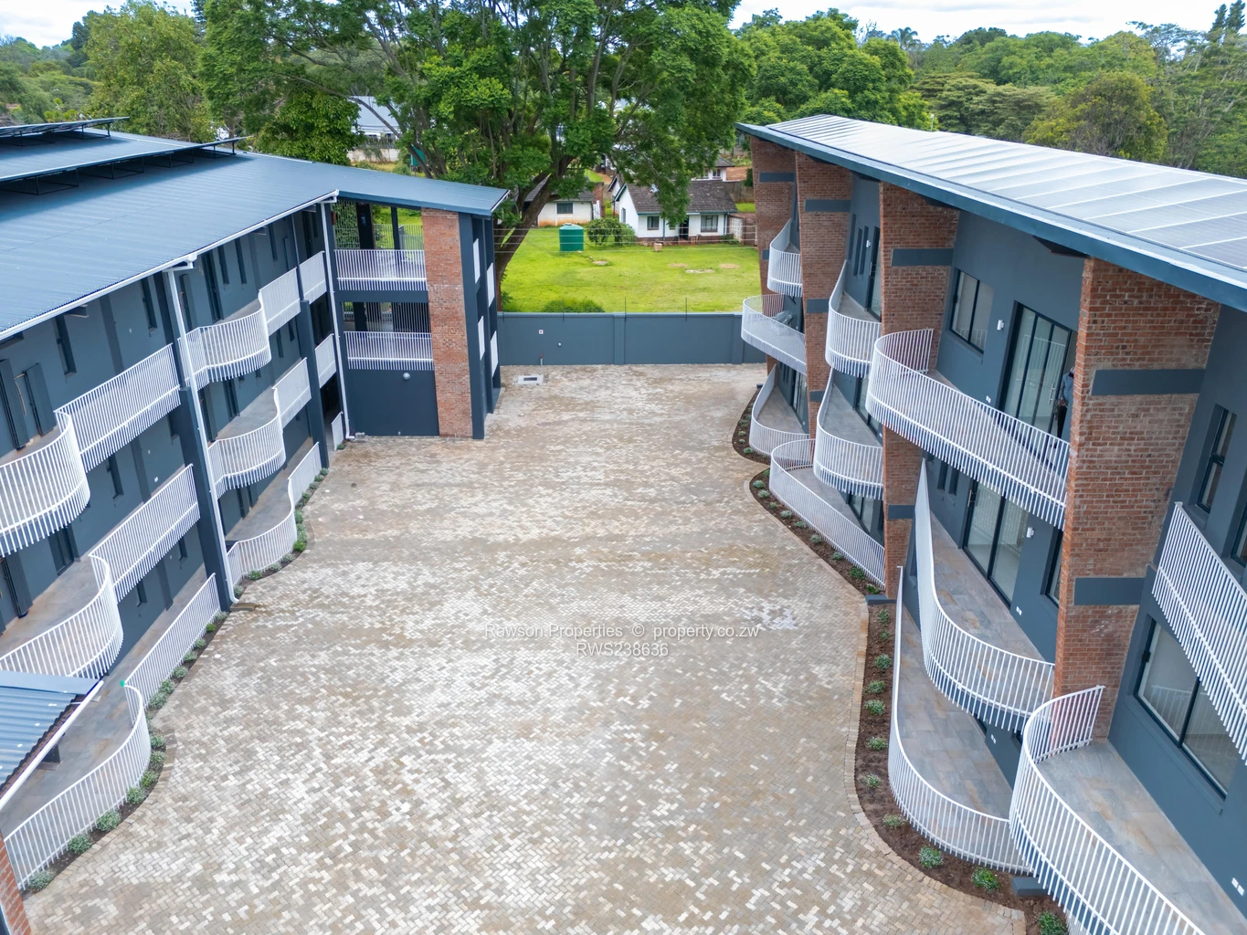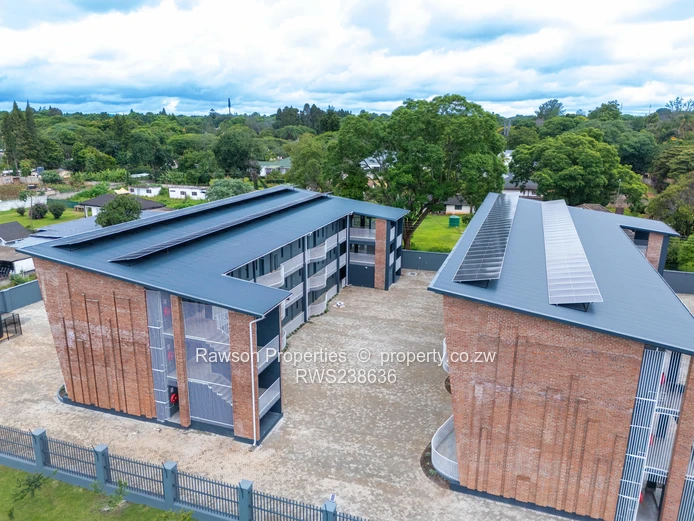 Discover contemporary living in Vainona, Harare North — a spacious 2-bedroom, 2-bath apartment spanning 180 m² in a smart, low-density block. The photos show a modern three-storey complex with a tidy central paved courtyard and plenty of parking. Interiors are bright and airy with large windows,