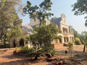 The property also boasts an additional wing featuring another guest bedroom with ensuite, scullery, pantry, a master kitchen, laundry room, dining space, and office.