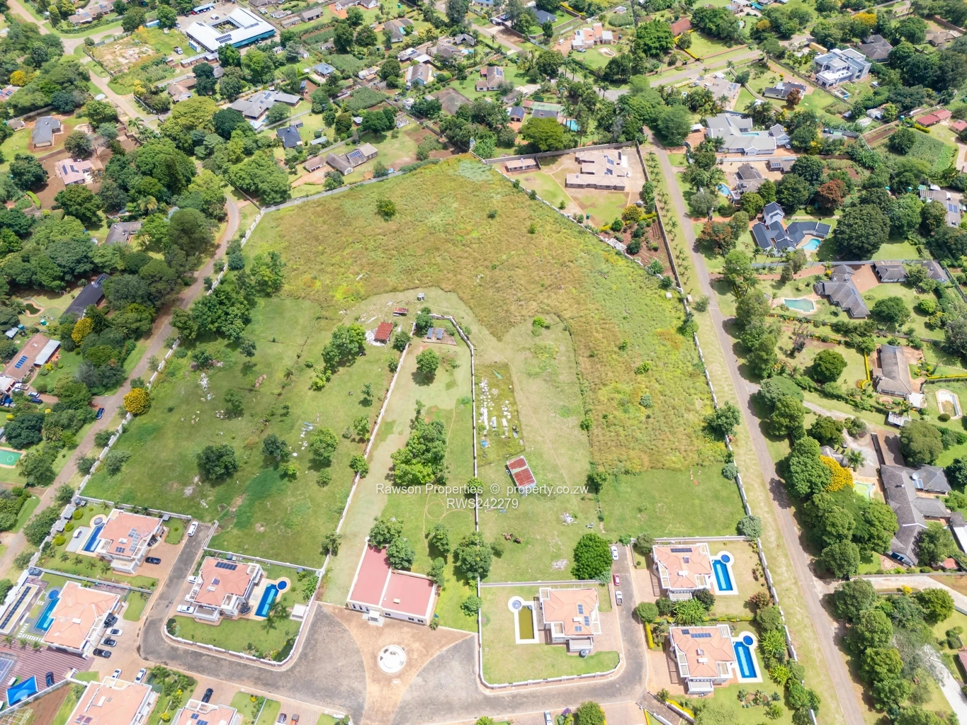 Prime development opportunity in Mount Pleasant, Harare North — 43,000 m² of largely level, build-ready residential land. As seen in the aerial images, the parcel is clearly outlined in yellow and sits tucked behind an established enclave of homes, offering privacy while remaining immediately adjacent to desirable residential streets. The site features a broad, gently undulating veld with mature trees and a defined private access lane/cul-de-sac leading into the property, ideal for subdivision into stands or a boutique gated estate.