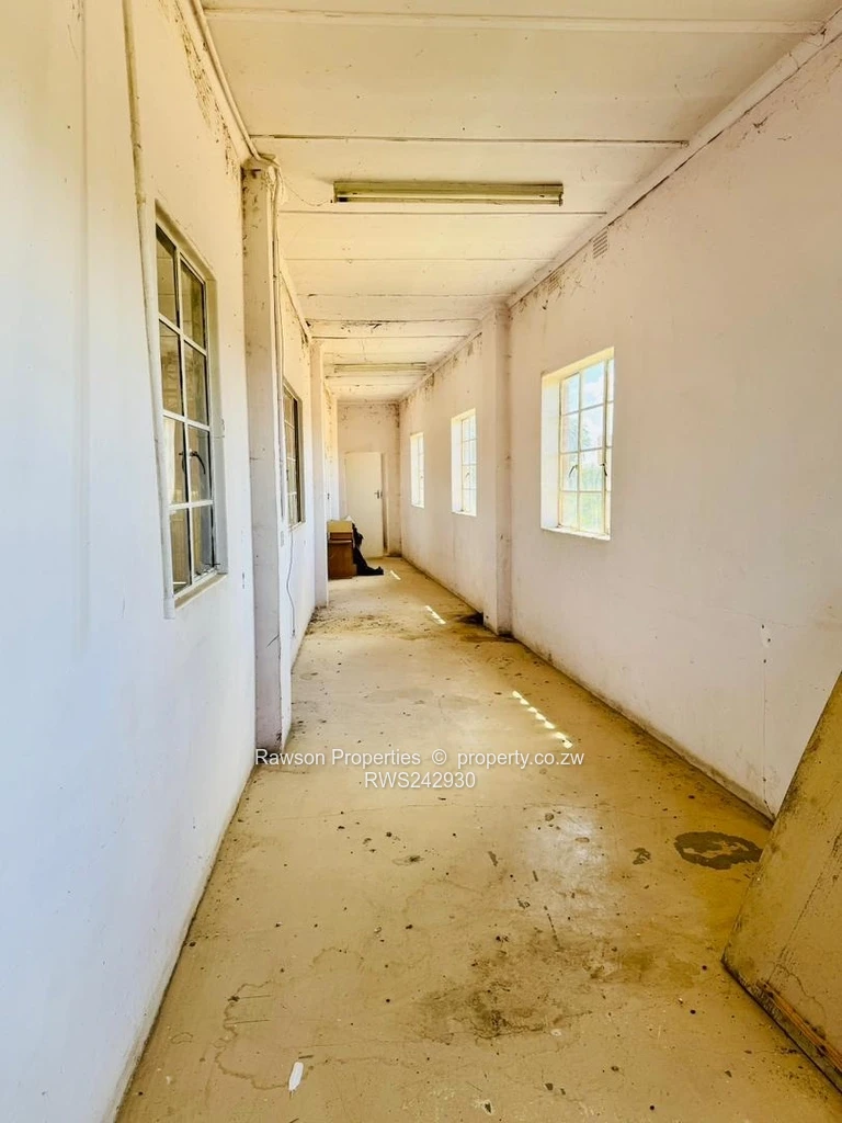 Upstairs mezzanine/office areas include a dedicated boardroom and a corridor of administrative rooms — perfect for on-site management, quality control or client meetings. The building benefits from municipal water and good ZESA supply, supporting production and operational needs. Solid brick construction, high eaves and industrial fenestration deliver character and functionality for manufacturing, warehousing, distribution or a specialised showroom.